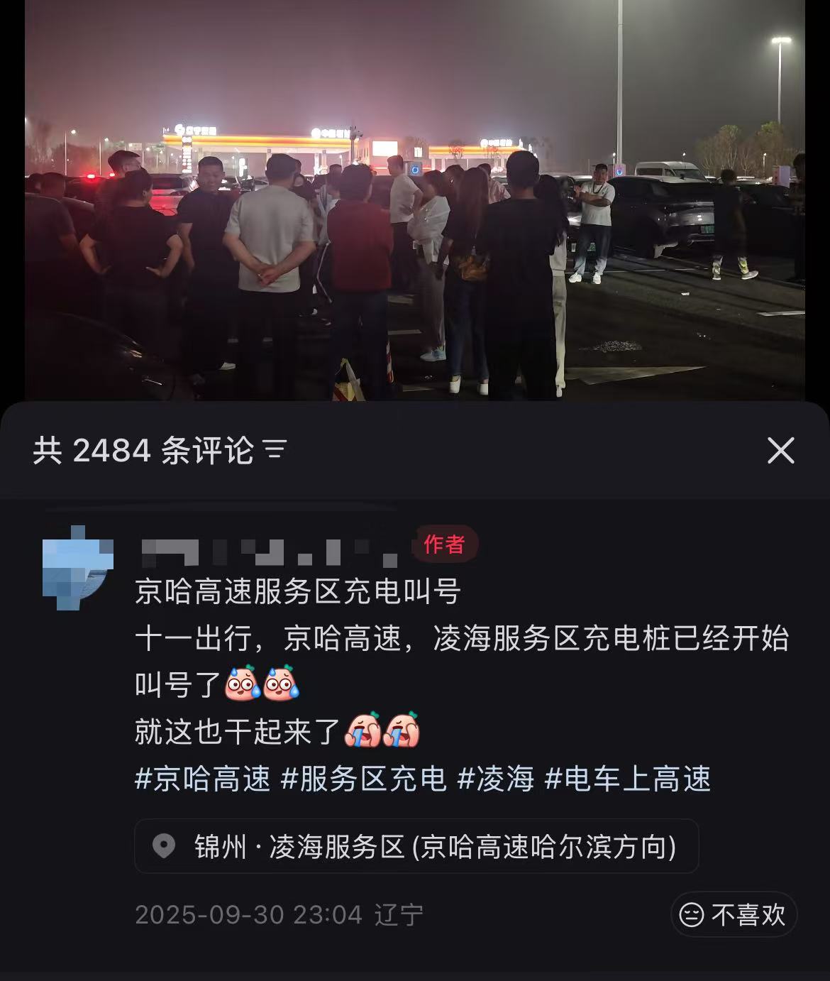 国庆长假开启,各地热门景点迎来大量游客。除了高铁、飞机,不少人也选择自驾出行。9月30日晚11点,有网友在小红书发布视频称,十一假期出行期间,京哈高速凌海服务区充电桩已开始叫号充电,现场有人举喇叭喊出“54号、55号”。