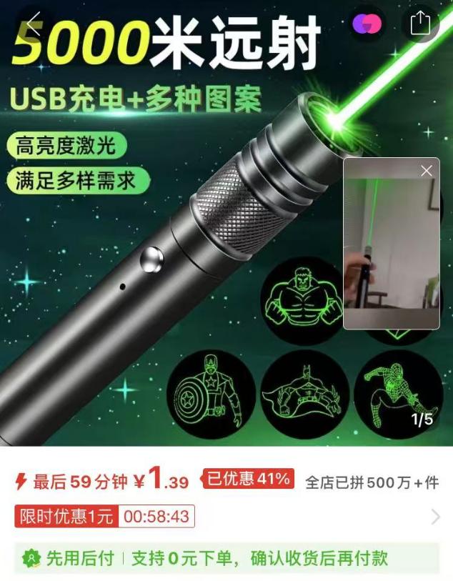 记者登录网购平台,检索发现类似的激光产品轻易就能买到,其中一款高亮度的品牌宣称可以远射5000米,带USB充电。