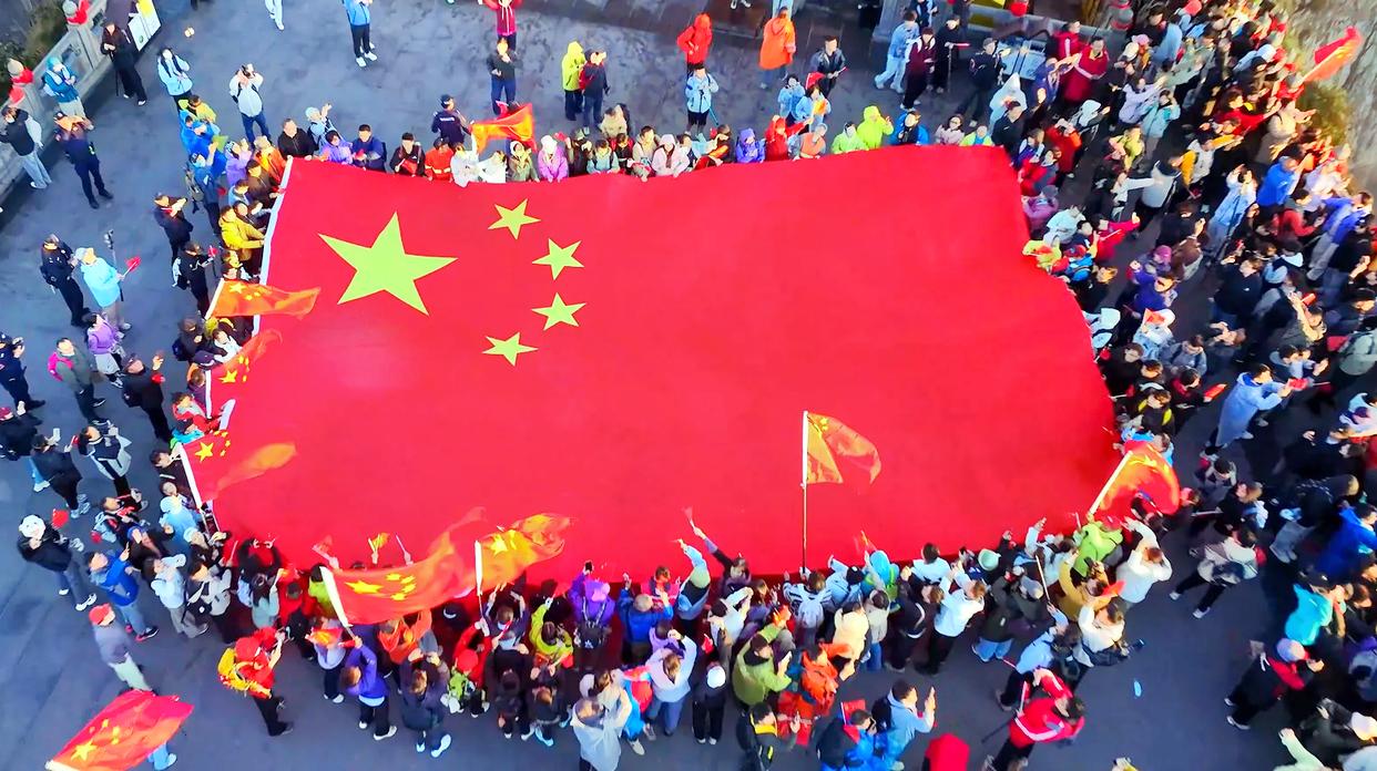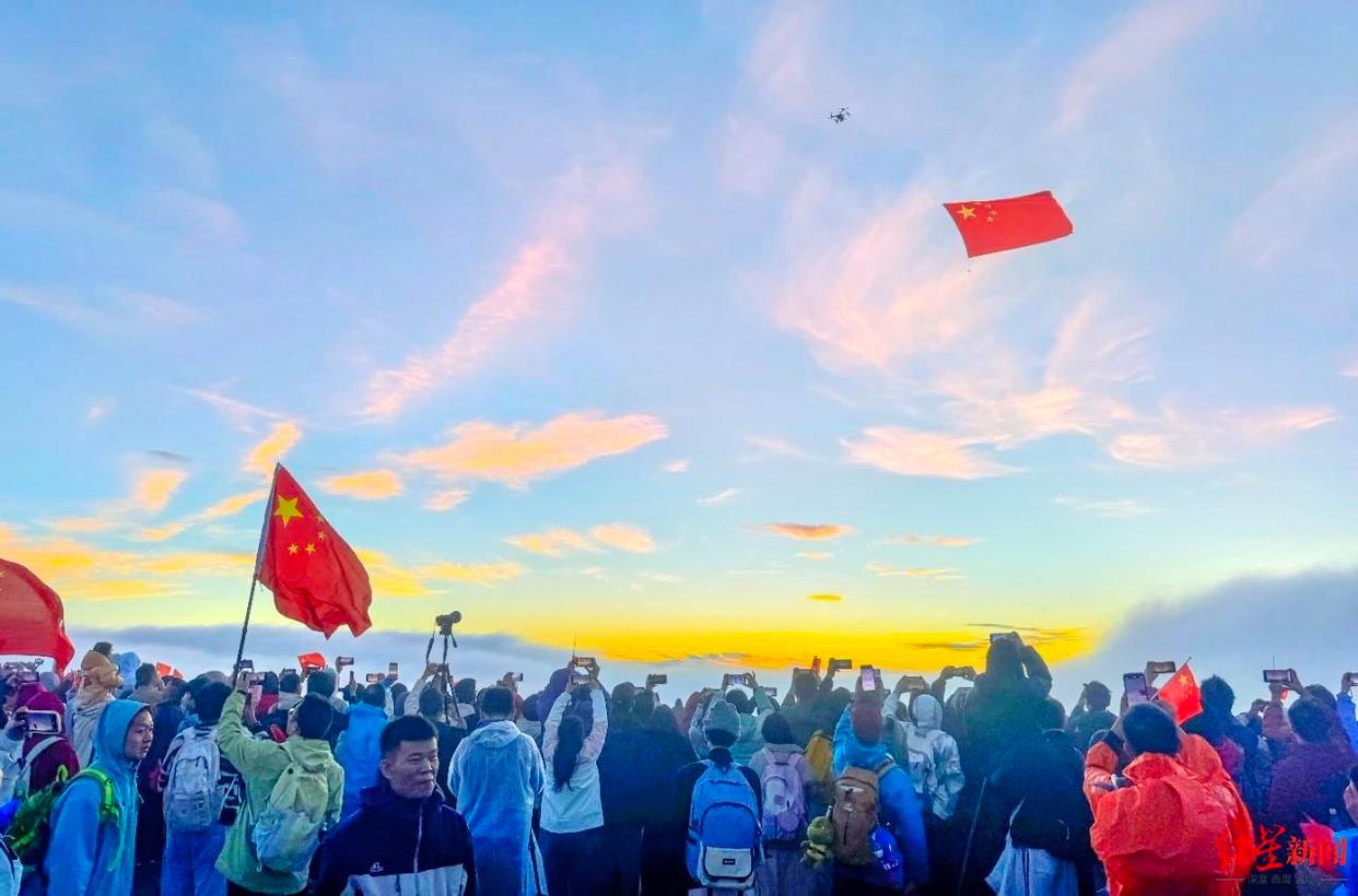 10月1日,国庆中秋假期首日,在四川峨眉山景区海拔3077米的峨眉山金顶,无人机升起鲜艳的五星红旗,游客们拉起巨幅国旗,共同庆祝祖国生日。在乐山大佛景区,数千名游客也齐唱红歌,表达对祖国的祝福。