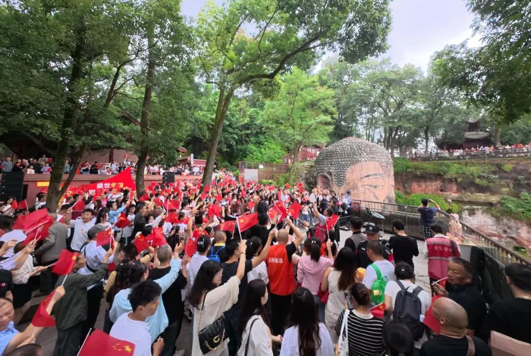 几十公里外的乐山大佛景区佛头广场上,一场“山河同唱・家国欢歌”千人红歌合唱活动激情唱响。“我和我的祖国,一刻也不能分割……”当熟悉的旋律响起,整个广场化为一片激情的红色海洋,游客们情不自禁挥舞国旗,放声高歌。