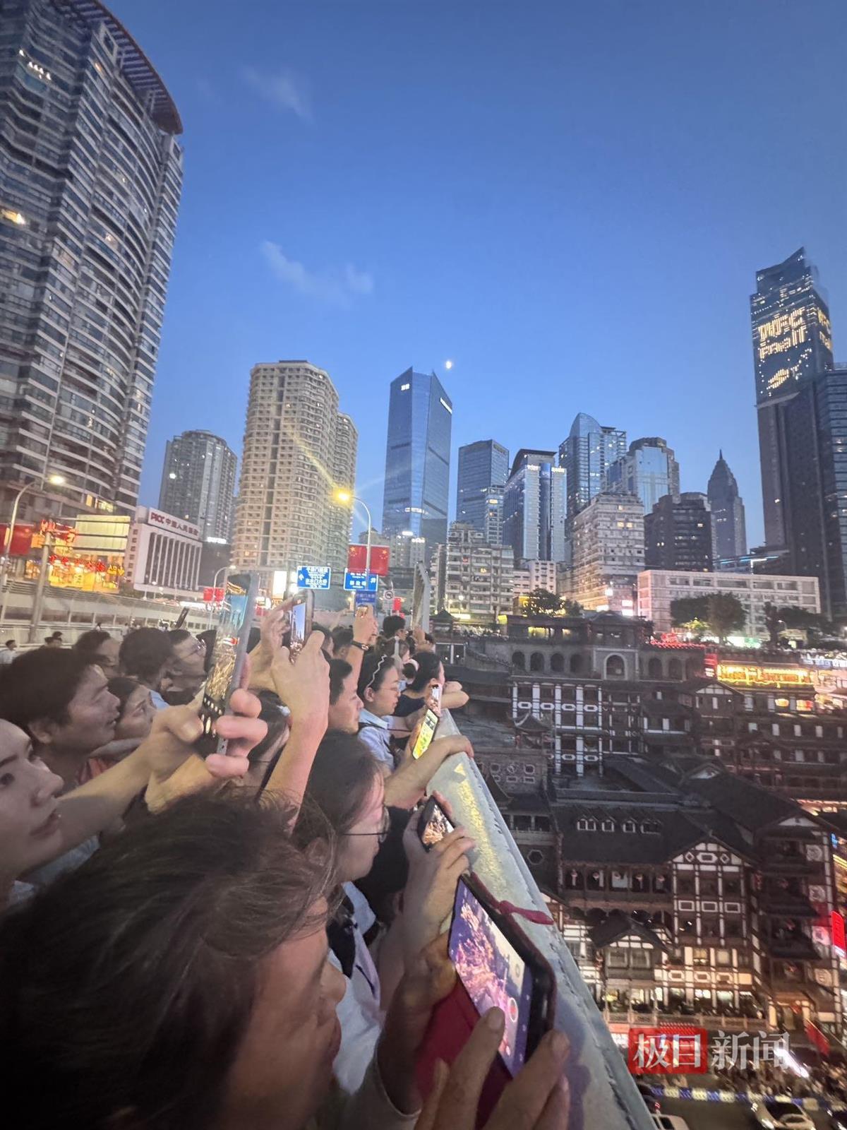 18时30分,太阳落下,余晖洒满了嘉陵江。凉风习习,将潮热的空气吹散,千厮门大桥的人行道上已经挤满了游客,他们举着手机或者相机翘首以待,等待着洪崖洞景区亮灯的那一刻。来自东北的张女士告诉记者,此次是专门带女儿来打卡,为避免错过,母女俩提前一个小时来占位置。