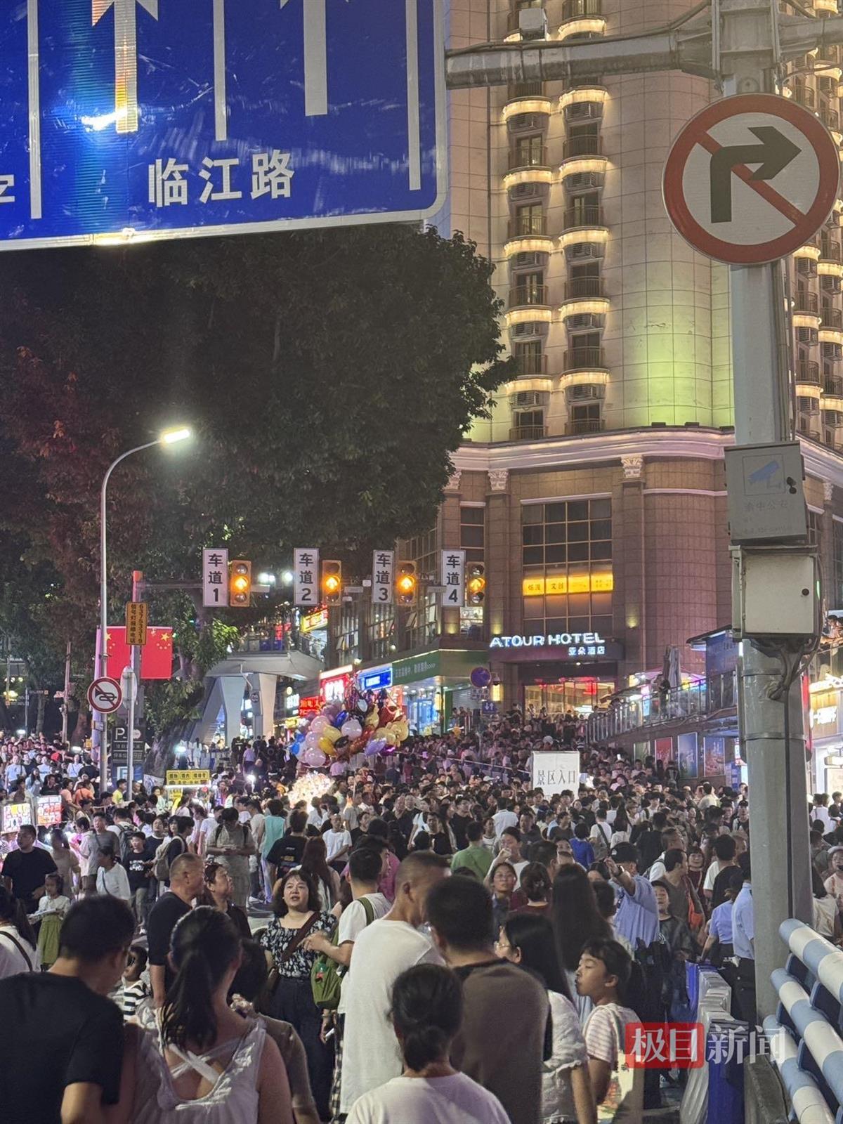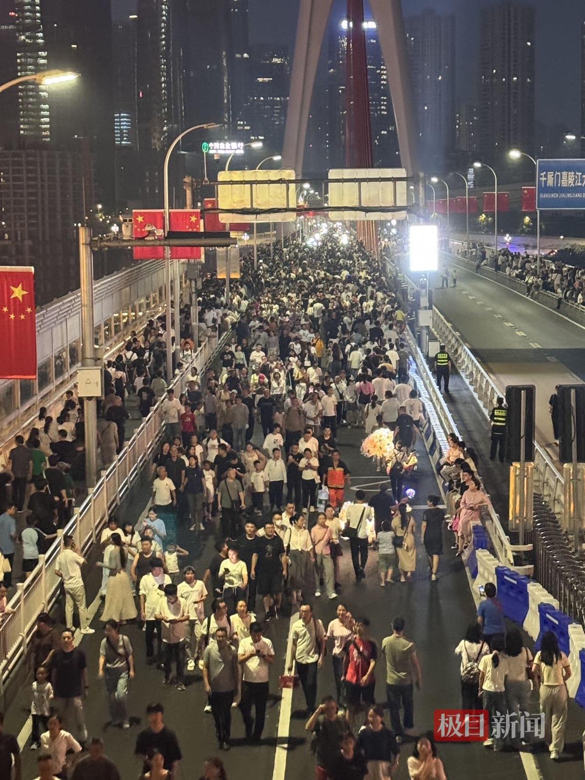 18时40分,千厮门大桥江北至渝中区的车道封桥,游客在桥上漫步或享受特色美食。19时双向车道封路,洪崖洞景区周边道路沧白路也实施了封路。现场执法的工作人员告诉极目新闻记者,目前还不是游客高峰时期,2日和3日,洪崖洞及周边景区将达到高峰,现在很多游客还在路上。