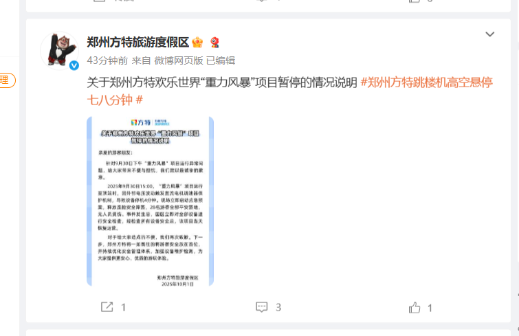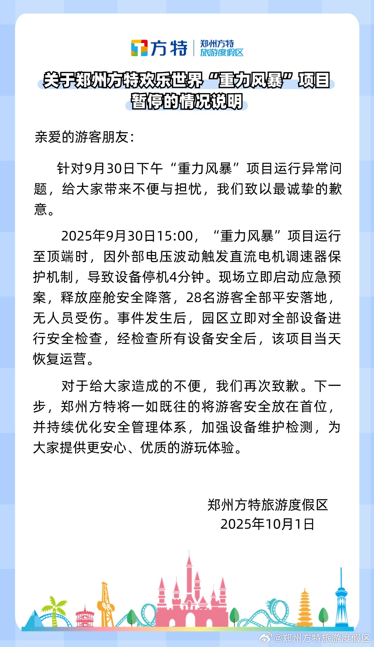 关于郑州方特欢乐世界“重力风暴”项目暂停的情况说明 #郑州方特跳楼机高空悬停七八分钟 #