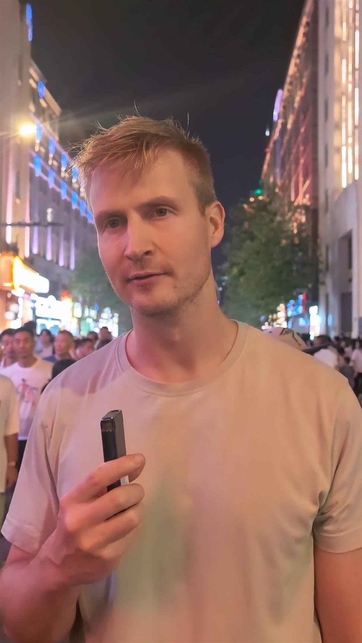 1日晚,在上海工作的外籍人士Igor也参与了南京东路步行街的盛况。他的祖父母是俄罗斯人。Igor说,一个星期后,他将回国。在上海的经历让他觉得中国是一个非常美丽的国家,他觉得人们都很友好,街道也非常安全。