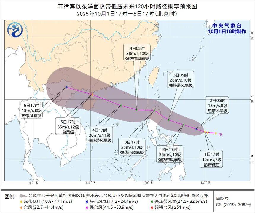 中国天气网首席气象分析师信欣介绍,未来在较高海温和较弱垂直风切变的环境下,该热带低压将继续增强,穿过菲律宾时减弱,进入南海后再增强,最强或可达台风级。目前预报来看,它大概率在10月5日登陆海南或广东雷州半岛。