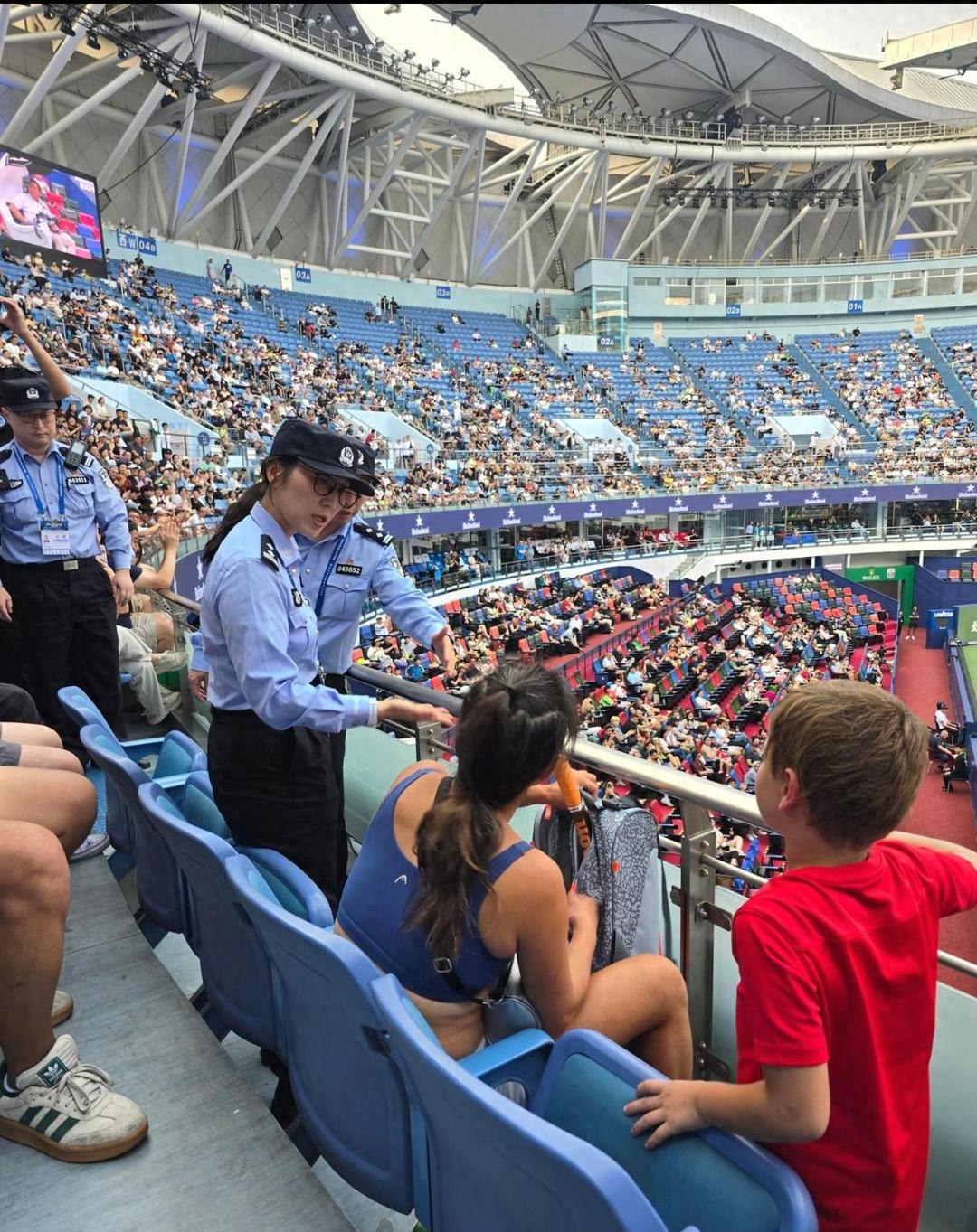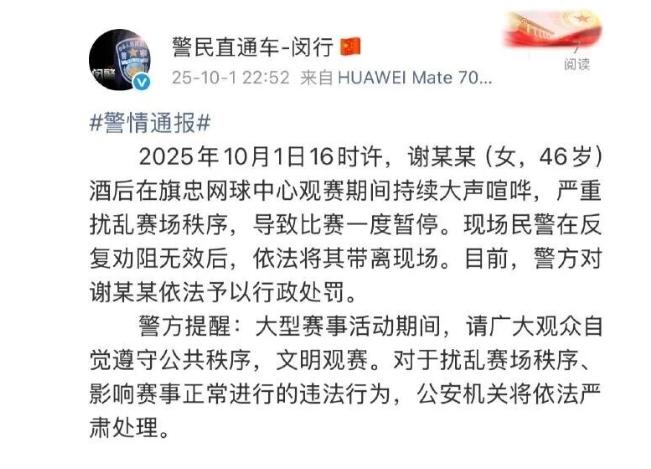 10月1日,上海警方就此事发布官方通报:谢某某(女,46岁)酒后在旗忠网球中心观赛期间持续大声喧哗,严重扰乱赛场秩序,导致比赛一度暂停。现场民警在反复劝阻无效后,依法将其带离现场。目前,警方对谢某某依法予以行政处罚。