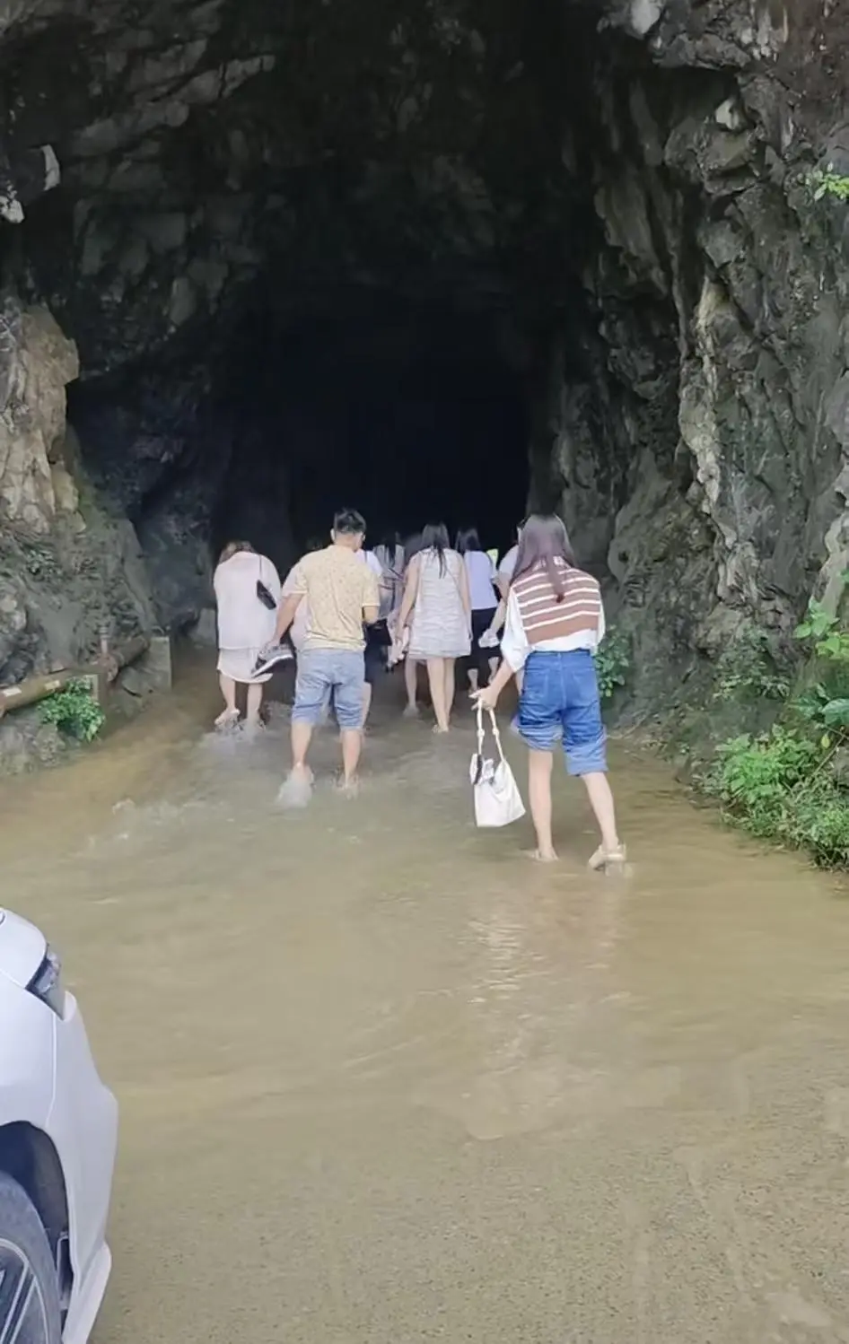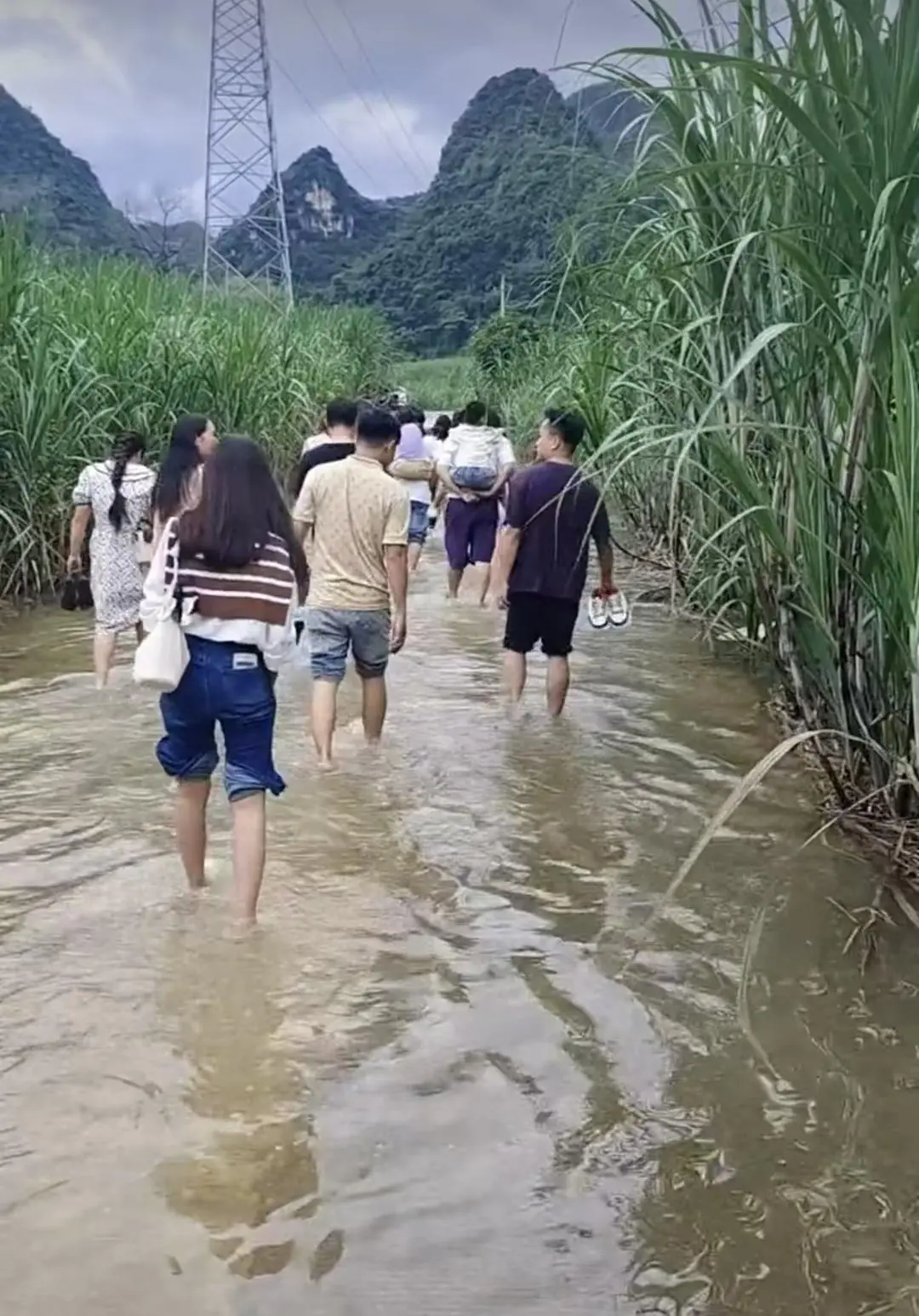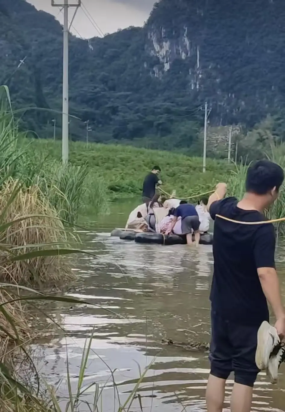 前两天,一位网友在社交媒体上发布一则视频并配文称:“翻山越岭,跋山涉水,只为去看表妹嫁去的地方。”视频中,众人将车停在路边,提着鞋子步行跨过积水路面,进入积水的山洞,又路过甘蔗地旁,甚至还乘坐由轮胎捆绑而成的“皮筏”。
