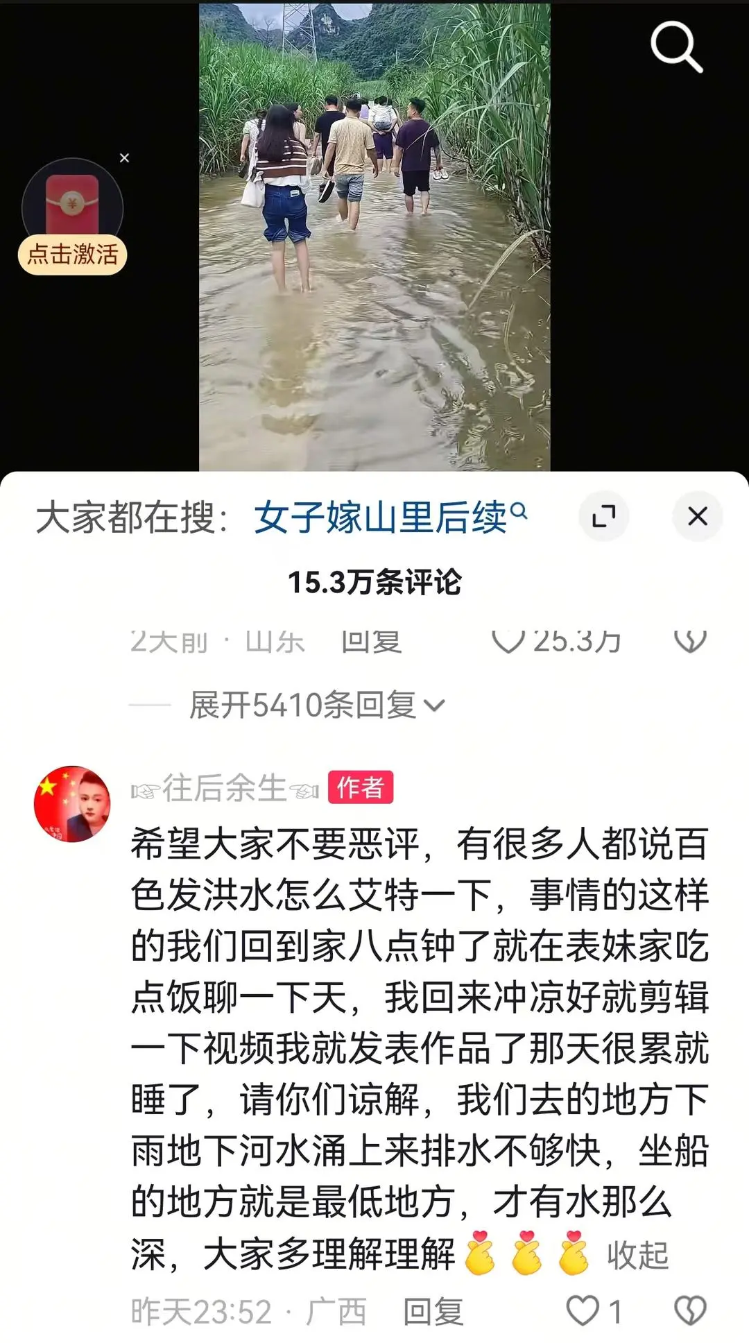 10月1日晚,发布该视频的网友“往后余生”称,“这个就是日常记录,不是拿天灾开玩笑,谢谢大家。”“希望大家不要恶评,我们回到家八点钟了,就在表妹家吃点饭聊一下天,我回来冲凉好就剪辑了一下视频,那天很累就睡着了,我们去的地方下雨,地下河水涌上来排水不够快,坐船那个地方就是最低地方,才有那么深的水。”