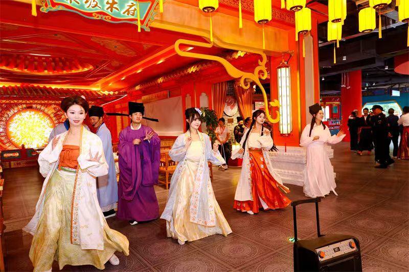 据介绍,以“东坡雅宴·此月同明”为主题的高端文化餐秀已开启试营业。项目联合眉州东坡等30余家市场主体,汇集东坡足迹地的特色美食,同步开设非遗美食研学课堂,游客可亲手体验东坡肘子等传统菜品的制作过程。在东坡主题剧本杀中,身着宋代襕衫的NPC(非玩家角色)引导游客解谜,让游客在互动中解锁东坡人生故事。双节期间,现场特别设置抽奖环节,每日消费游客均可参与,双人餐秀套票、东坡文创礼盒等福利将持续放送。