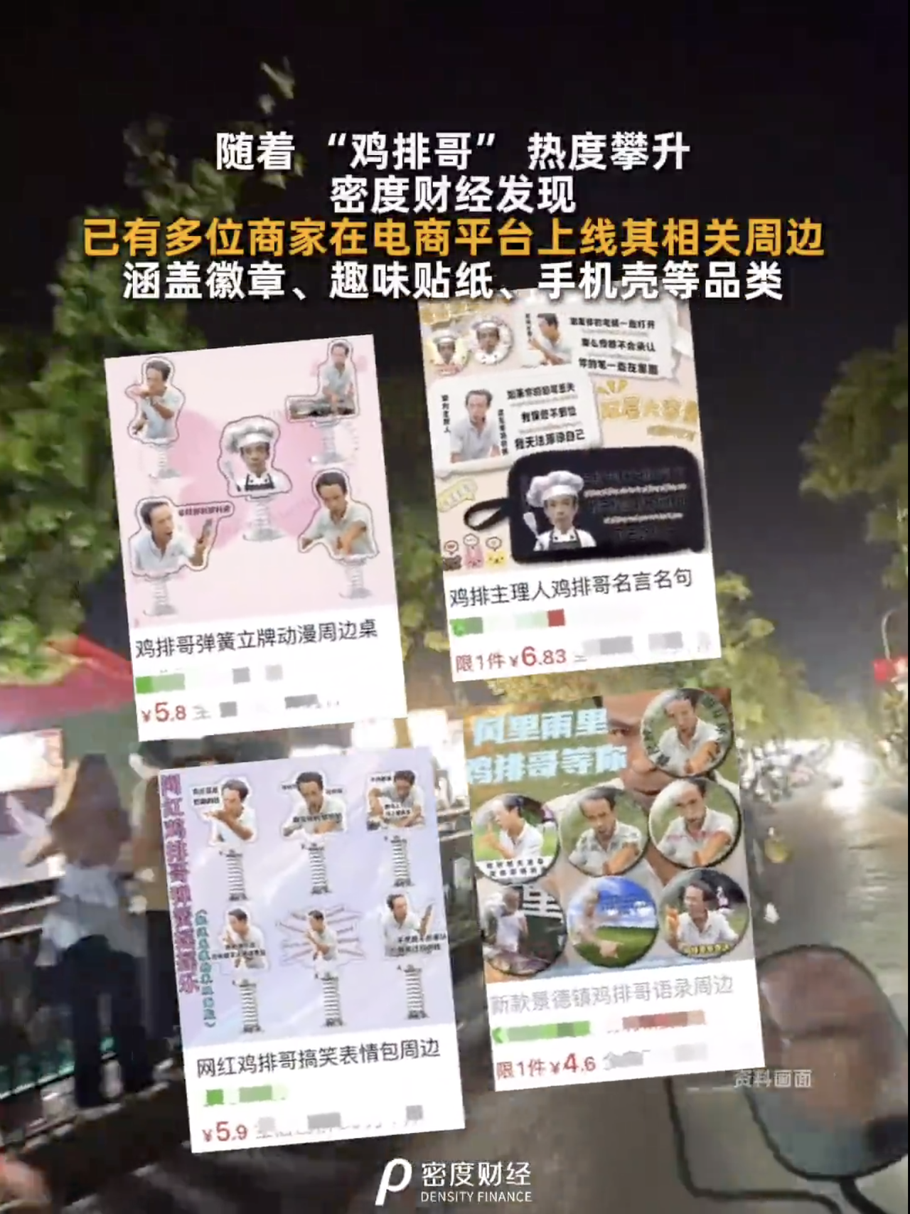 10月2日,江西景德镇。“鸡排哥”凭借 “做完你的做你的”“这种场面我还是在控制”等经典语录和对顾客的热情服务态度走红网络,吸引大批游客专程前来打卡。国庆假期期间,“鸡排家族”也持续热情迎接游客。随着 “鸡排哥” 热度攀升,@密度财经发现,已有多位商家在电商平台上线其相关周边,涵盖钥匙扣、手机挂饰、卫衣等品类。