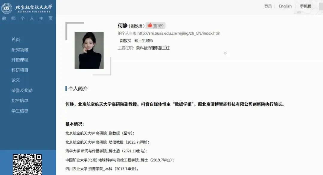 据极目新闻报道,10月1日,记者了解到,这名授课老师名叫何静,2021年10月从清华大学新闻传播学博士后出站,现为北航人文与社会科学高等研究院(以下简称“高研院”)科技治理中心副主任、副教授。官网教师个人主页显示,她还是2024、2025年“中国AI春晚”节目的幕后技术支持者和共创者。