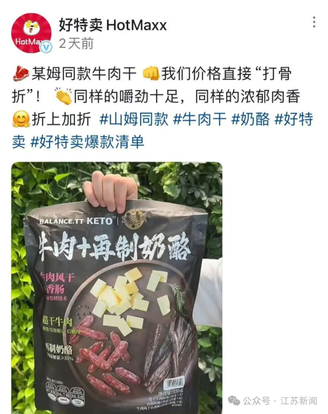 此前,记者看到好特卖在某平台发布“牛肉+再制奶酪”的视频,配文“某姆同款牛肉干,我们价格直接打骨折”,带有山姆同款的话题词。30日下午,记者发现好特卖官方号里已经没有这条视频了。