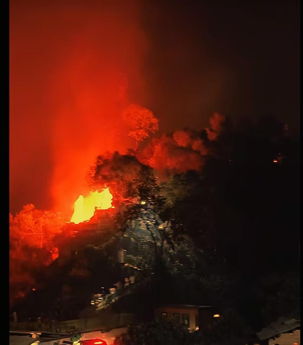 在游客惊艳之时,一些飘落烟花将山林引燃。人群中一声惊呼“着火了”,游客们纷纷踮脚张望,只见山坡上的火线在夜色中清晰可见。