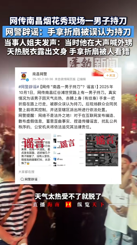 真实情况为该男子因天气炎热,赤膊上身(有文身)手拿一把折扇在路上行走,被群众误认为持刀。后现场群众会同民警上前将其控制,并送至辖区派出所进行依法处置。