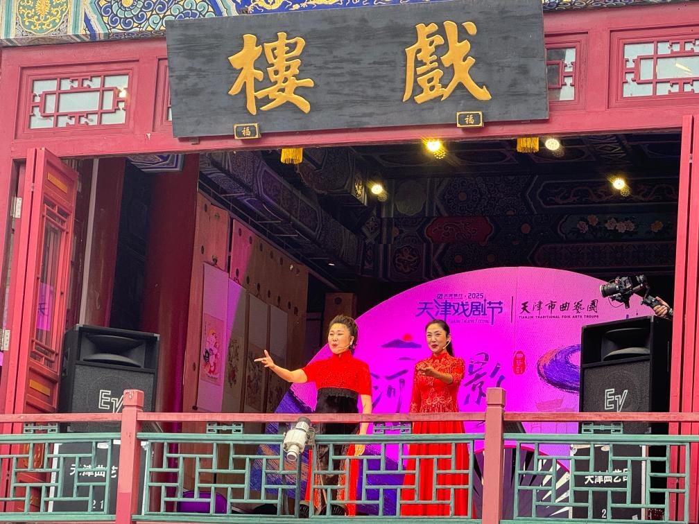 10月1日,天津市曲艺团两位演员在古文化街戏楼表演曲艺剧《海河故影》。新华社发