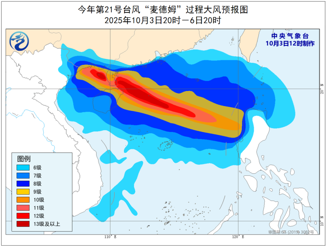 大风预报:3日夜间至6日白天,广东雷州半岛和中西部沿海、广西沿海、海南岛及沿海、西沙群岛、中沙群岛、黄岩岛附近海域将有6到8级风,南海中北部、琼州海峡、北部湾中北部有9到11级风,“麦德姆”中心经过的附近海域或地区风力可达12到14级、阵风15到17级。