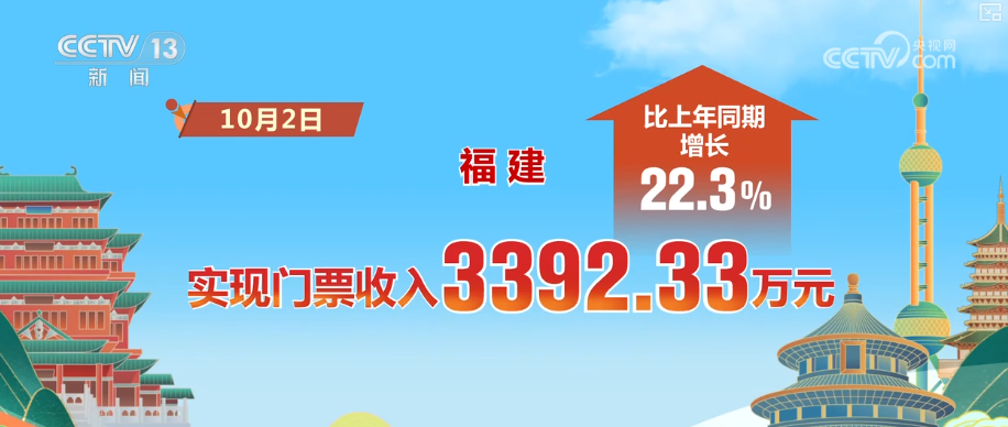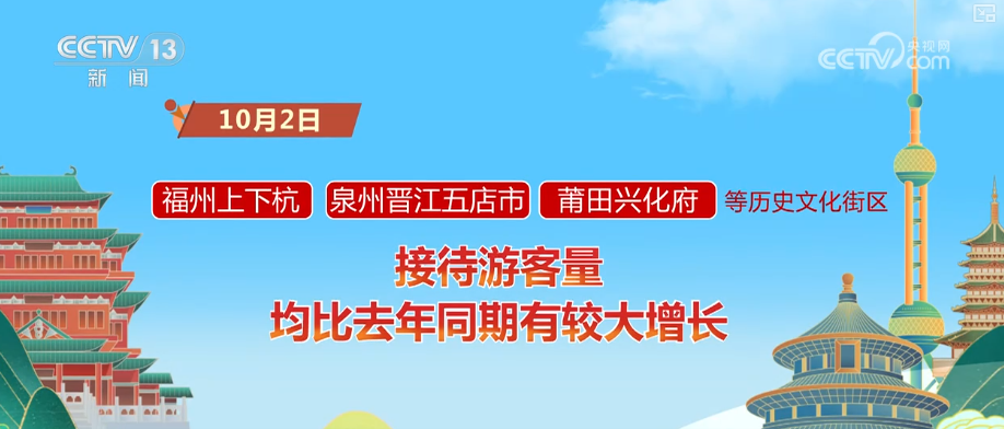 福建的各类历史文化街区、古城、古镇持续火爆。福州上下杭、泉州晋江五店市、莆田兴化府等历史文化街区,10月2日接待游客量均比2024年同期有较大增长。4A级及以上景区接待游客461.5万人次