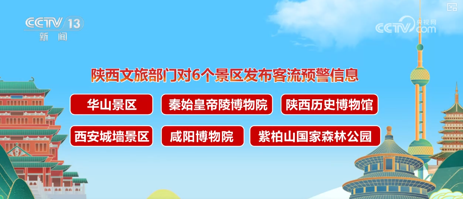 陕西文旅部门通过监测重点A级旅游景区客流情况,对分别是华山景区、秦始皇帝陵博物院、陕西历史博物馆、西安城墙景区、咸阳博物院等6个景区发布客流预警信息。接待国内游客75.5万人次 旅游花费4.5亿元