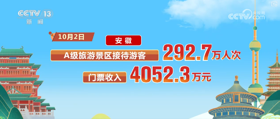10月2日,安徽省A级旅游景区接待游客292.7万人次,门票收入4052.3万元。其中,5A景区接待40万人次,同比增长1.3%。