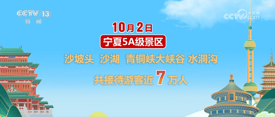 宁夏5A级景区沙坡头、沙湖生态旅游区、青铜峡大峡谷、水洞沟是游客的热门打卡地,这几个核心景区10月2日共接待游客近7万人次。接待国内游客近334万人次 356个景区免门票