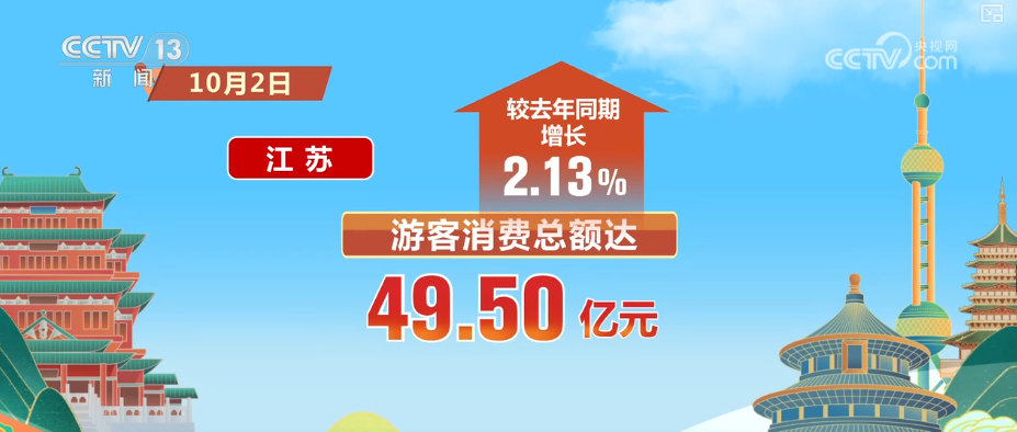 据江苏智慧文旅平台监测,国庆中秋假期第二天,江苏纳入监测的文旅单位共接待游客1314.41万人次,游客消费总额达49.50亿元,较2024年同期分别增长2.71%和2.13%。