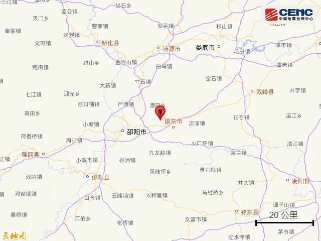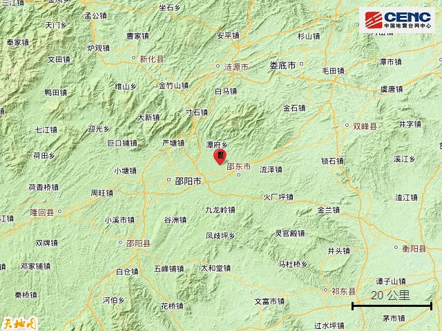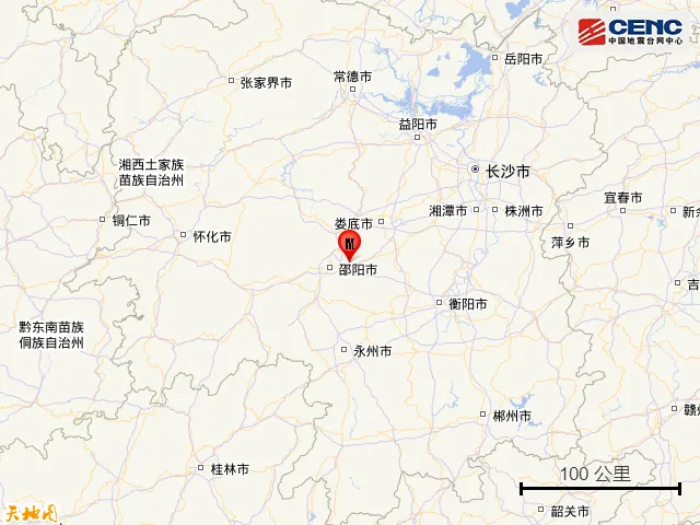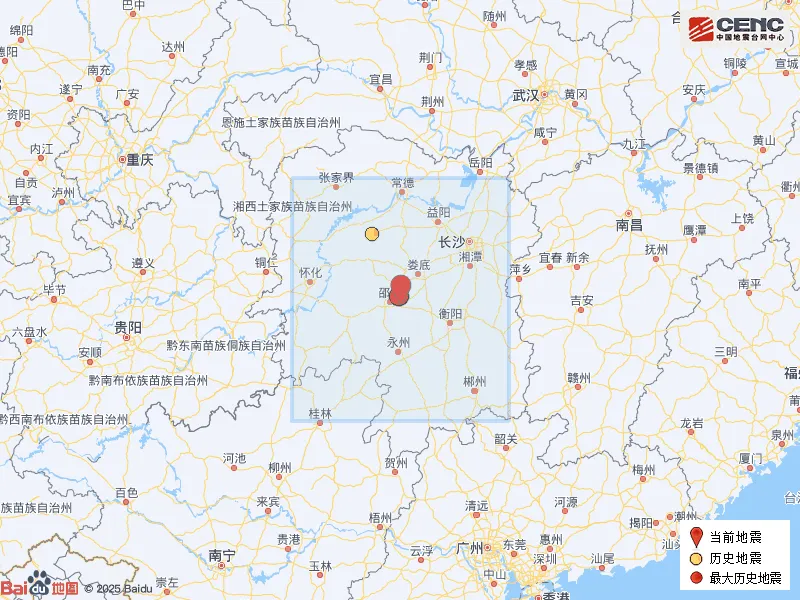 历史地震:根据中国地震台网速报目录,震中周边200公里内近5年来发生3级以上地震共2次,最大地震是2025年10月3日在湖南邵阳市邵东市(塌陷)发生的3.7级地震(距离本次震中4公里),历史地震分布如图。