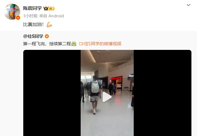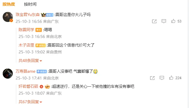 记者注意到,10月3日下午4时54分,陈震还转发内容并配文“加油”,不少网友在评论区询问此事。面对网友“听说你逆行”的追问未作回应,仅对“这是你大儿子吗”的提问回复“嗯嗯”。