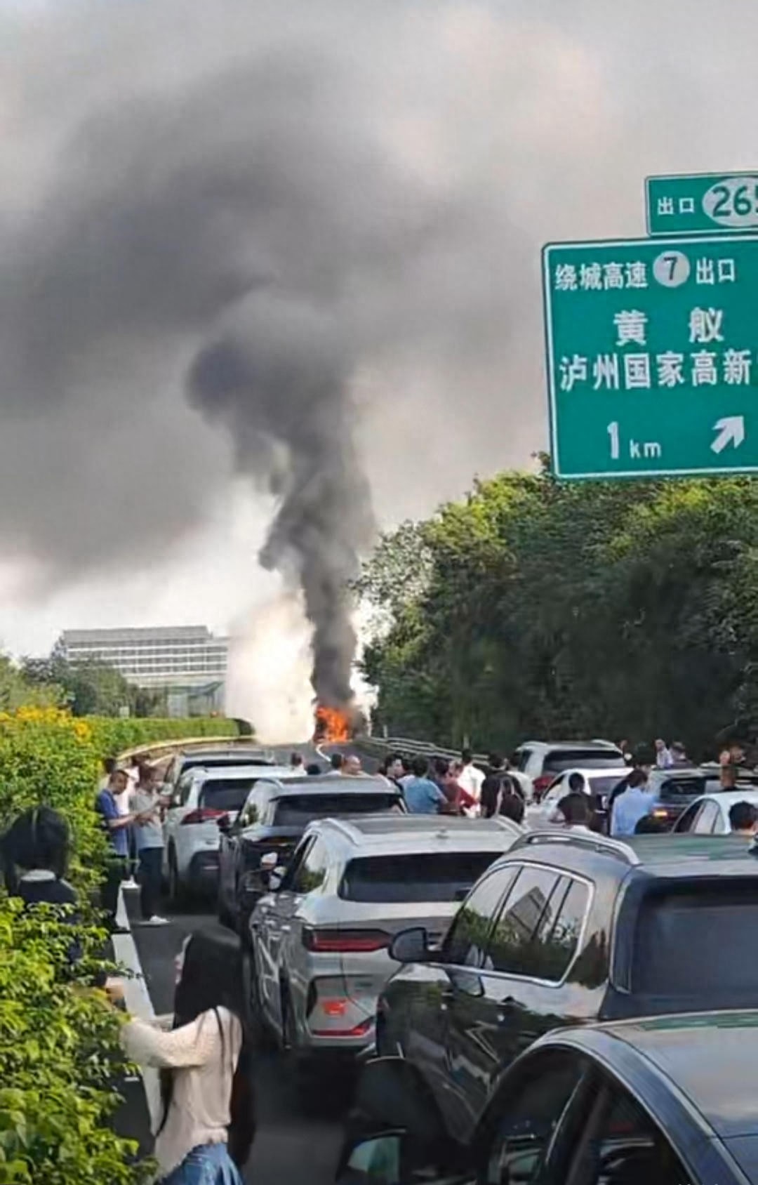 网传视频显示,事发地为泸州绕城高速公路7号出口(黄舣)附近路段,事故造成该侧高速公路道路交通中断,车辆排成长龙等待通行。视频拍摄者称“油罐车爆炸起火,消防车已经开始作业了,在泸州。”视频中可听到警笛声。