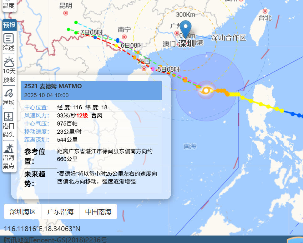 今年第21号台风“麦德姆”将继续趋向粤西到海南岛,将于10月4日下午至5日早晨以台风级或强台风级从深圳南部海面掠过,距深圳最近距离约350-400公里。10月4日12时00分,深圳市气象台发布台风蓝色预警信号,深圳市(含深汕合作区)4日夜间至5日阵雨频密,并伴有8-9级最大阵风。