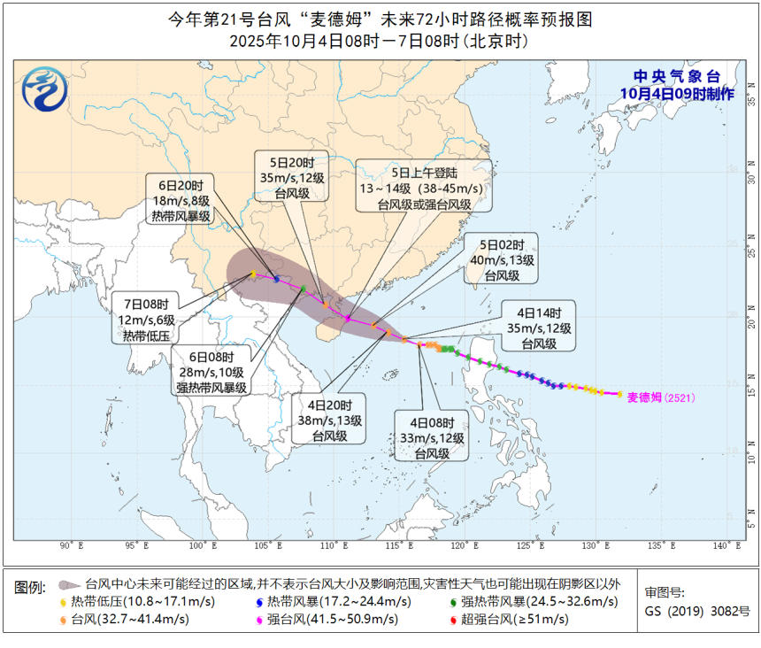 据中央气象台最新消息,台风“麦德姆”(台风级)4日10时中心位于深圳东南偏南方约544公里的南海海面上,中心风力12级(33米/秒),中心最低气压975百帕,七级风圈半径300-380公里,十级风圈半径80-100公里。