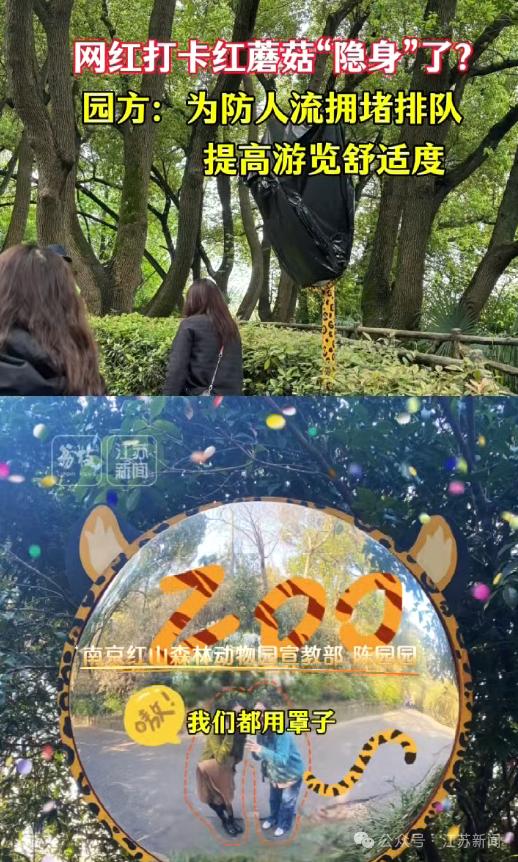 国庆期间,网友发现南京红山森林动物园里,路边的网红“小蘑菇”打卡点、猫科动物造型的转弯镜都被遮挡。