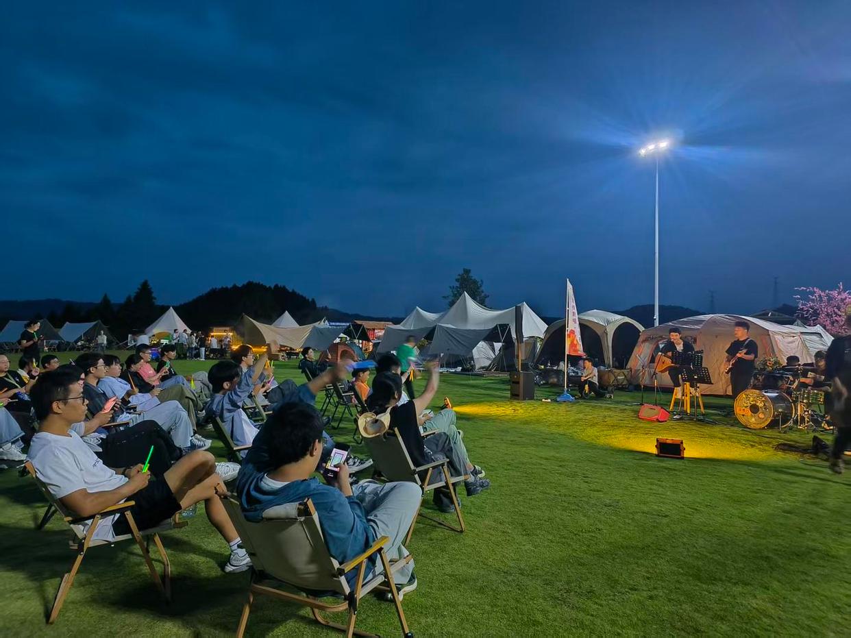 白天的热情在夜晚得到延续。当夜幕降临,三号烽火台旁的营地灯光亮起,星空音乐派对准时开场。游客们挥舞荧光棒,跟着专业乐队的节奏,一首《我和我的祖国》引发全场大合唱,歌声响彻山野。