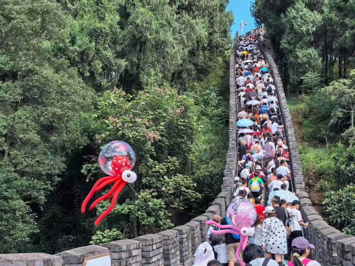金龙长城位于成都龙泉山中段,毗邻洛带古镇,是距离成都市区较近的龙泉山登高观景点和传统登高福地。金龙长城全长仅约1.6公里,设有5个烽火台。轻松户外与亲子友好的定位,让这条被誉为“比万里长城少9997里”的迷你长城,成为成都市民国庆出游的热门选择。“10月3日单日游客接待量突破2万人次,达到近十年来的最高峰。”金龙长城景区相关工作人员告诉记者。