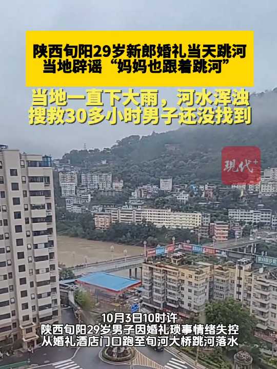 10月3日,陕西省旬阳市一男子在婚礼当天跳河引发关注。10月4日下午,当地应急管理部门一名工作人员告诉现代快报记者,事发后多个部门全力搜救,截至目前依然没有找到男子。该工作人员还对网上传言“新郎婚礼前跳河妈妈也跟着跳下去”这一消息进行了辟谣。