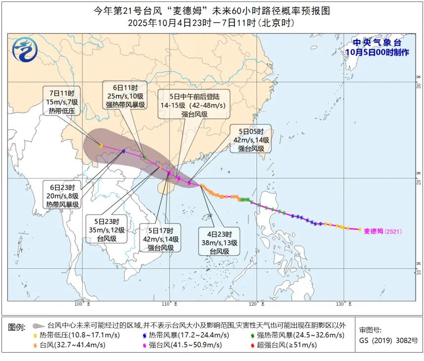预计,“麦德姆”将以每小时25公里左右的速度向西偏北方向移动,强度继续增强,并将于5日中午前后在广东电白至海南琼海一带沿海登陆(强台风级,14-15级,42-48米/秒)。