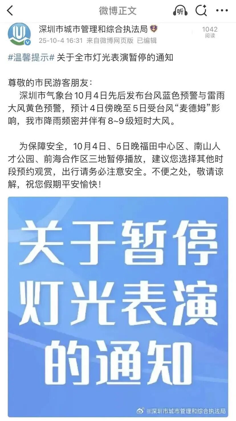 10月4日下午,深圳市城市管理和综合执法局发布全市灯光表演暂停通知。