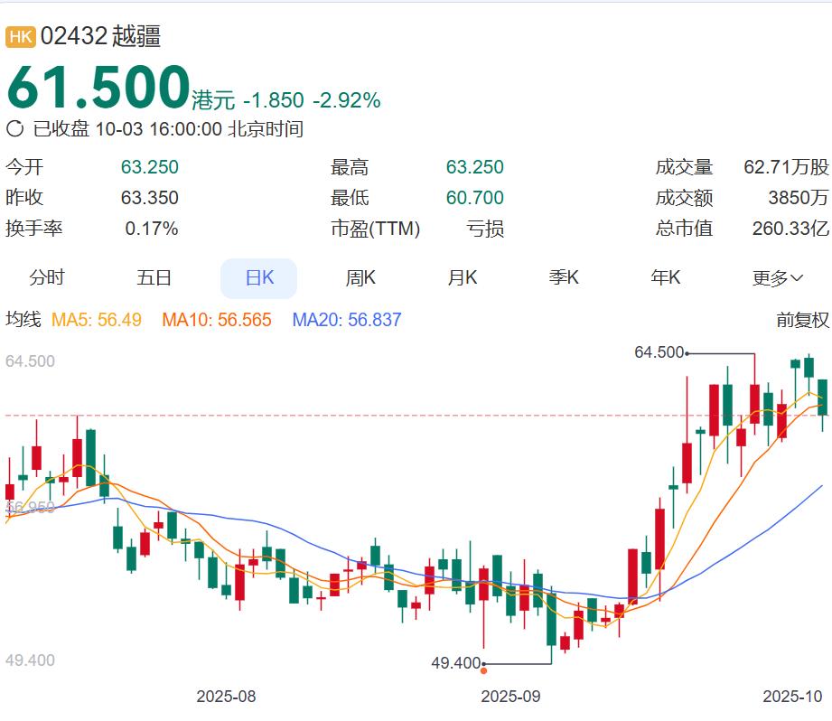 截至10月3日收盘,越疆科技股价报收61.5港元,年内涨幅超159%,总市值260.33亿港元。