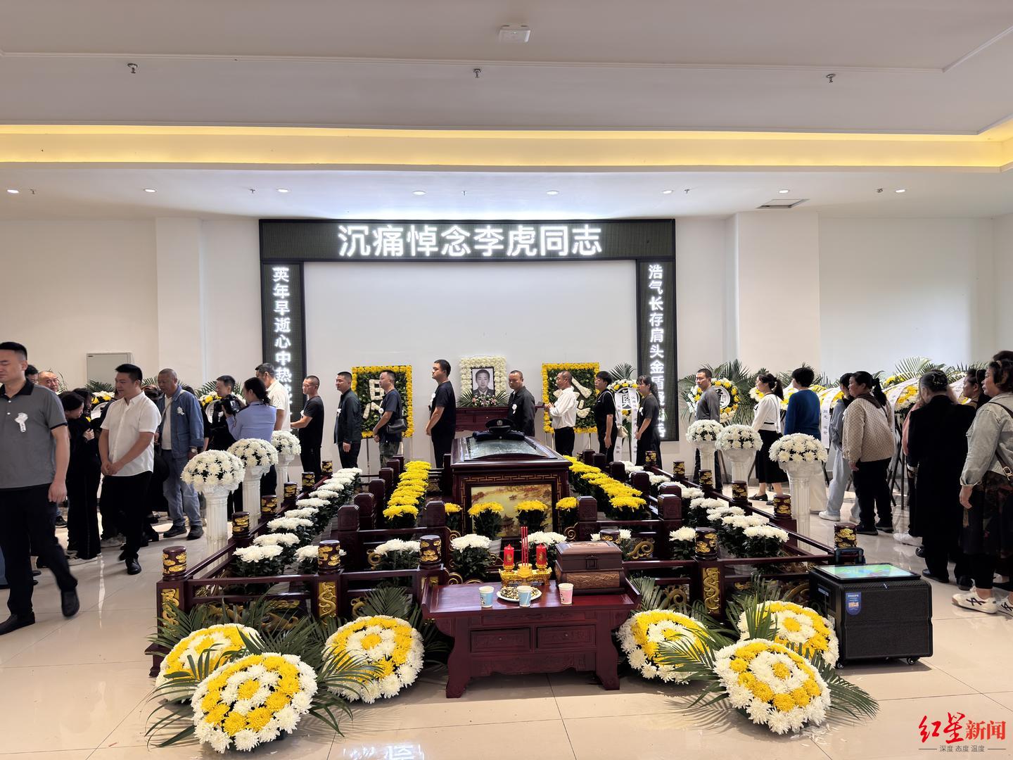 “英年早逝心中热忱汇江海、浩气长存肩头金盾凝山岳。”遗体告别式当日,宜宾和屏山城区都飘起了小雨,似乎山河都在垂泪呜咽。青山园李虎悼念厅庄严肃穆,花圈和花篮代表了人们的哀思。李虎生前的领导、同事、战友、群众等400余人冒雨赶来送别李虎最后一程,现场气氛凝重悲痛。
