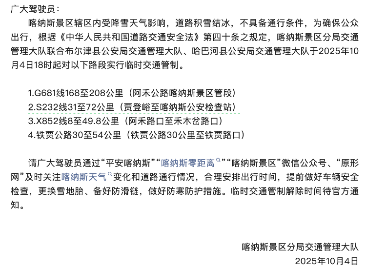 10月1日,“平安喀纳斯”公众号发布公告称,对部分路段进行交通管制,10月2日道路积雪已清理完毕,达到安全通行条件,2日10时30分已对景区部分路段解除交通管制。但在10月4日下午4时许,“平安喀纳斯”公众号又发布公告称,喀纳斯景区分局交通管理大队联合布尔津县公安局交通管理大队、哈巴河县公安局交通管理大队从2025年10月4日18时起对以下路段实行临时交通管制:G681线168至208公里(阿禾公路喀纳斯景区管段);S232线31至72公里(贾登峪至喀纳斯公安检查站);X852线8至49.8公里(阿禾路口至禾木岔路口);铁贾公路30至54公里(铁贾公路30公里至铁贾路口)。