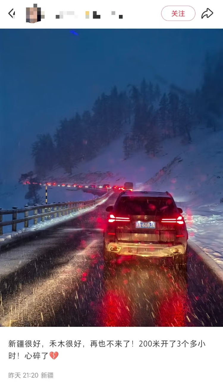 北京游客殷女士告诉上游新闻记者,他们一行4日下午5点从禾木出发,5日凌晨4点20分左右才住进前往布尔津途中一个小镇子上的宾馆。“两小时的车程走了近12小时,后面被困在山里的人和车依然很多。凌晨两点我们才跟着前车慢慢走,路上有交警撒盐除雪,救援车辆也准备就绪。不过到镇上的路特别不好走,大雾弥漫能见度只有一两米。”