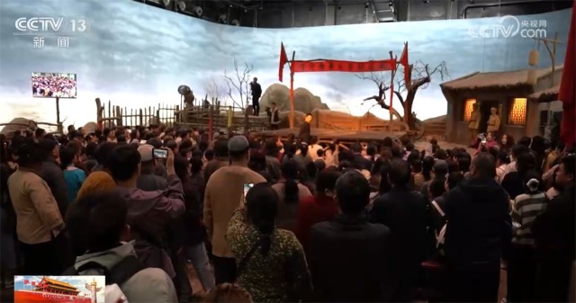 在采用声光电技术再现的战斗场景前,现场观众驻足凝视,通过这些生动的展示感受当年参加渡江战役先烈们的大无畏精神。