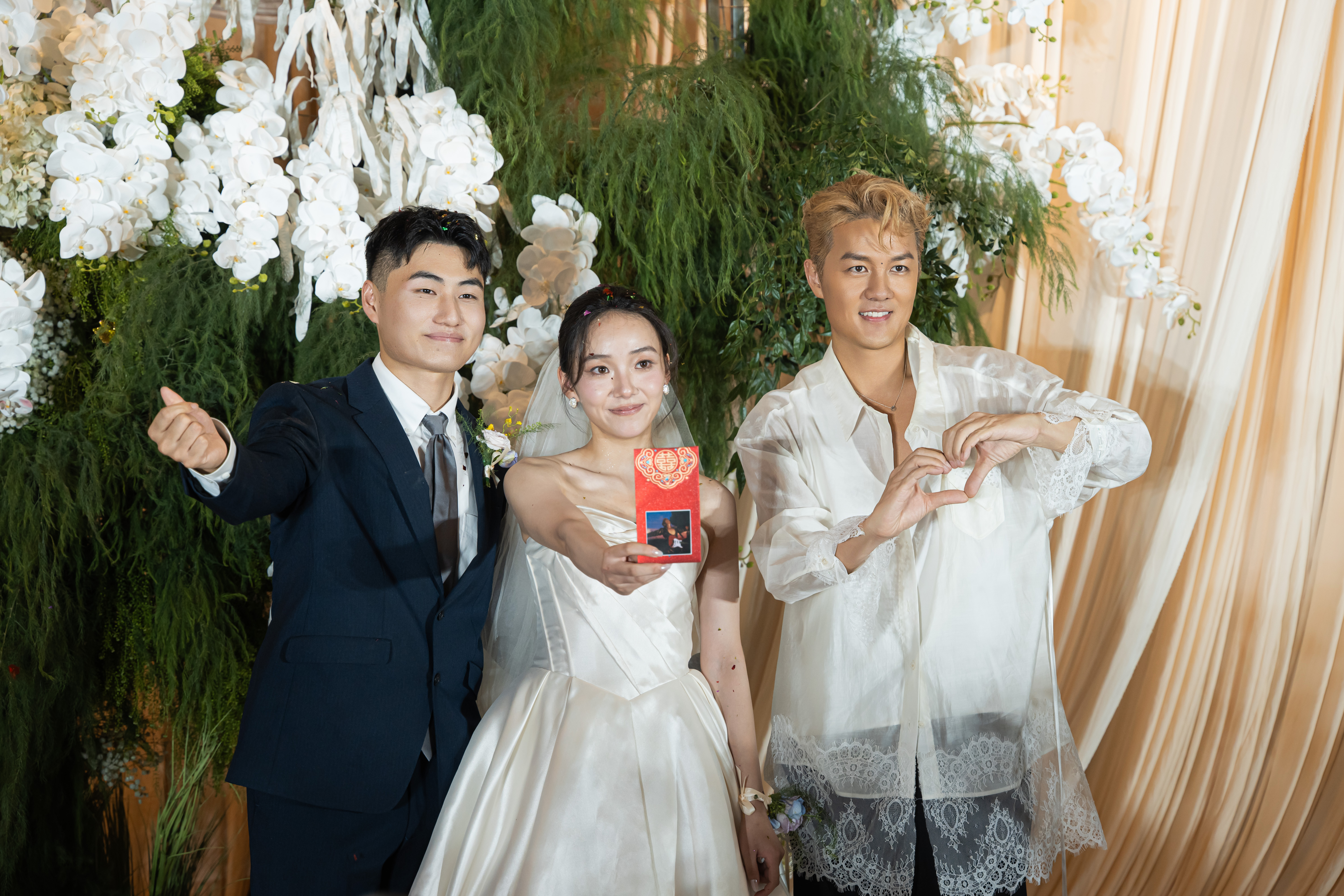 吴克群在婚礼现场与新人合影。