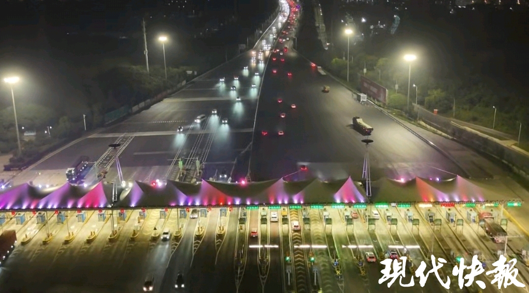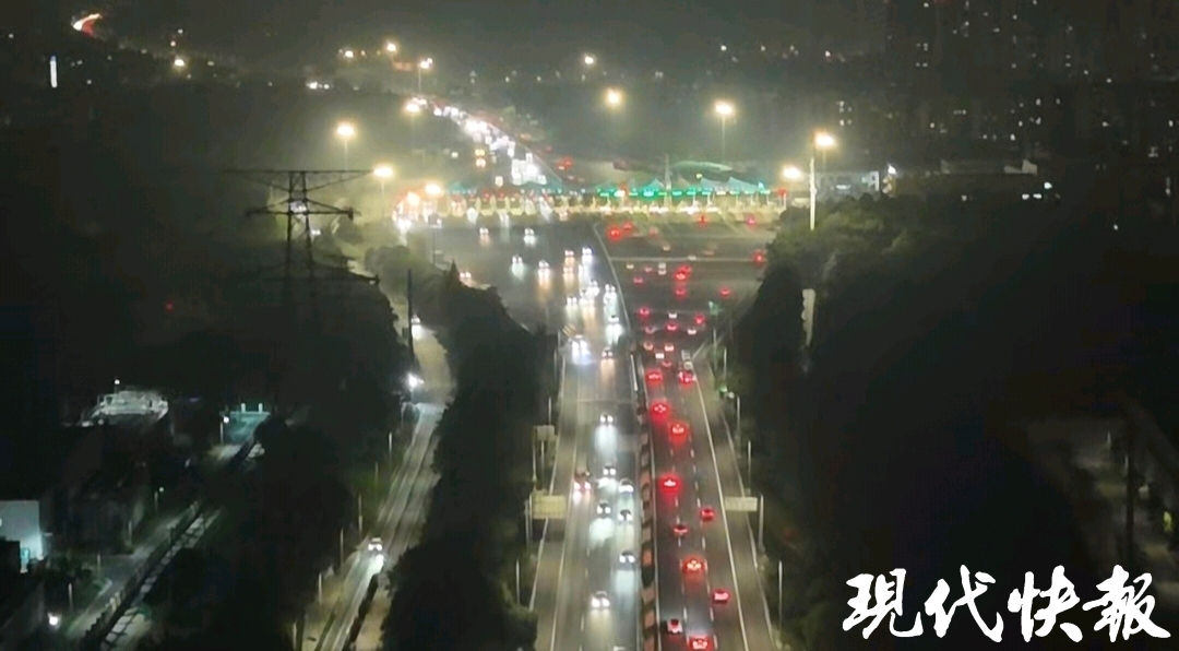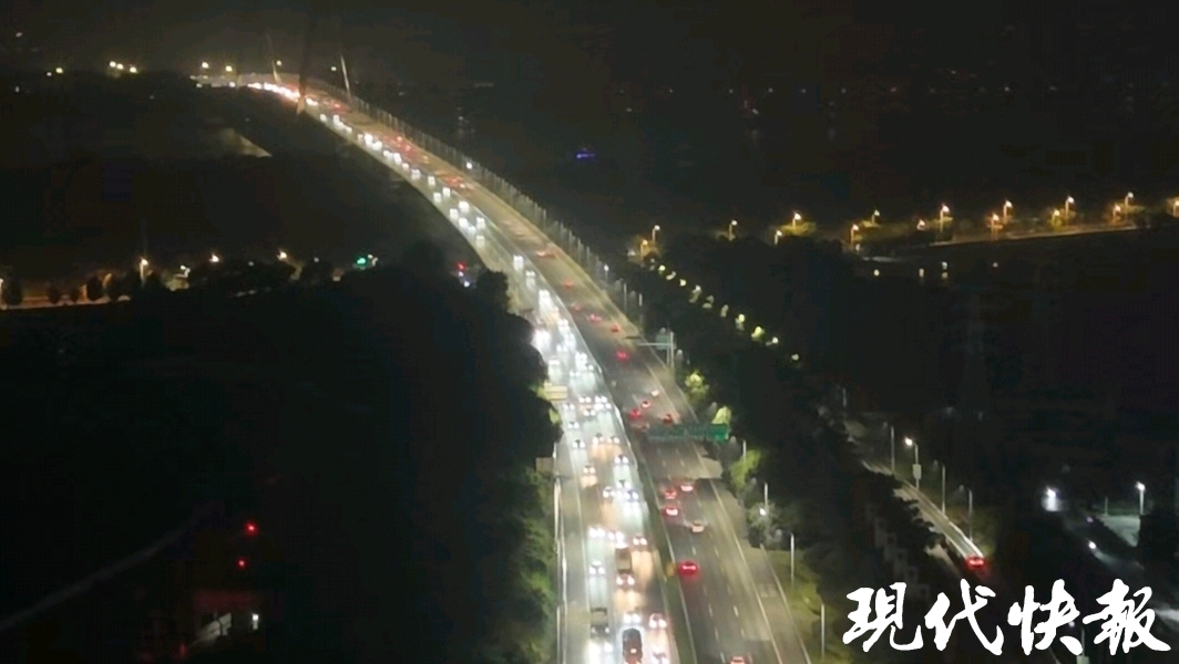 现代快报讯(通讯员宁交轩 记者王瑞)10月5日22时,南京交警高速二大队的巡逻车沿八卦洲长江大桥不断往返,悬停在南汊桥上方的金陵飞鹰警用无人机镜头里,由北向南黄白色的车头灯与由南向北的红色尾灯基本持平,滚滚车流织成一条醒目的流畅光带。