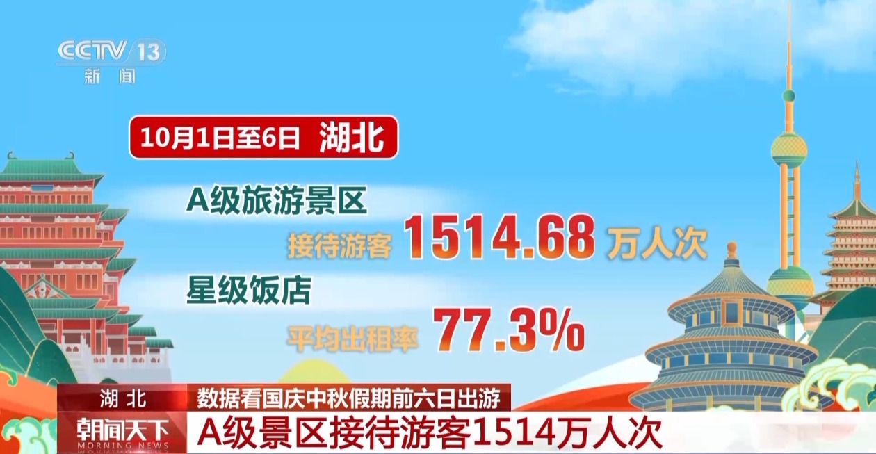假期以来,截至昨天,湖北600多家A级旅游景区接待游客1514.68万人次。星级饭店平均出租率超过77%。