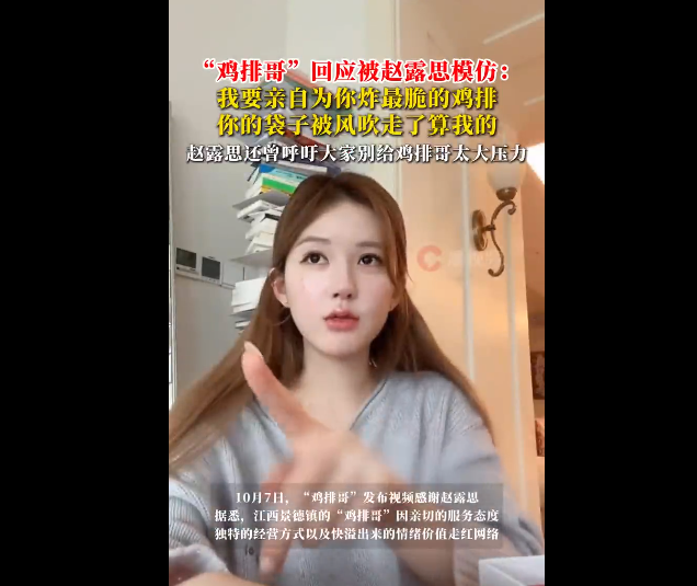10月7日,鸡排哥发视频回应此事,表示既惊喜又暖心,并欢迎赵露思来到景德镇,“我将给你炸制最脆的鸡排”。
