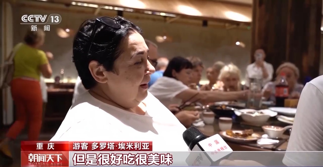 而作为国际消费中心城市的重庆,在这个假期,凭借立体山水地貌、特色麻辣美食等丰富的文旅资源,同样吸引了大量国际游客前来体验。在重庆解放碑,记者遇到了一个来自欧洲的旅行团。整个团一共有60多名游客,他们当天已经打卡了磁器口古镇和解放碑周边的多个景点。麻婆豆腐、回锅肉,热腾腾的锅气和麻辣鲜香的味道让外国游客们大饱口福。