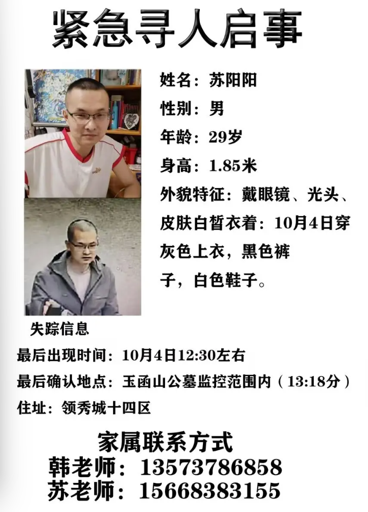 “他身高1米85,戴眼镜,光头,失联当天穿灰色上衣,黑色裤子,白色鞋子。”苏阳阳家属说。