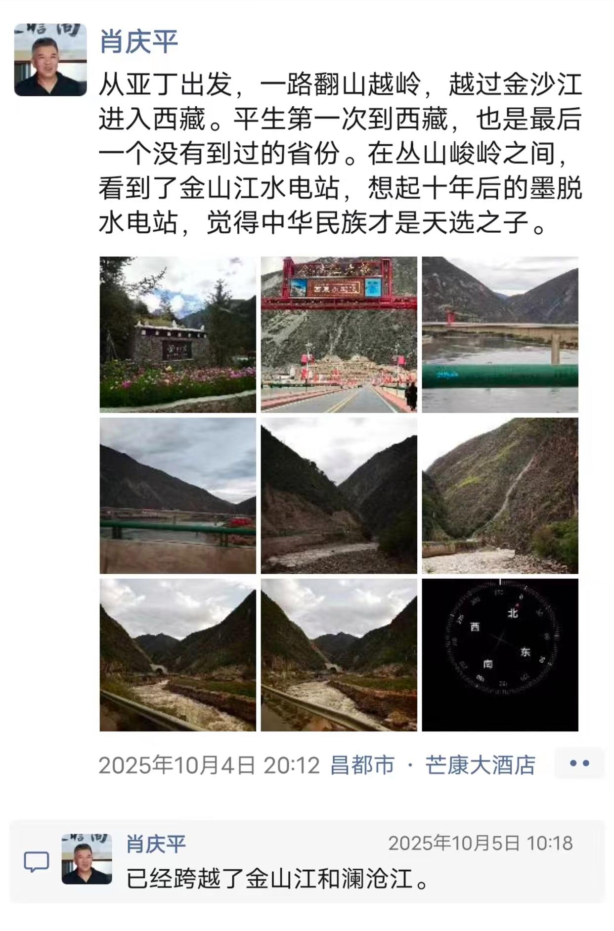 消息人士提供的肖庆平朋友圈截图显示,肖庆平曾于10月4日晚发文:从亚丁出发,一路翻山越岭,越过金沙江进入西藏。平生第一次到西藏,也是最后一个没有到过的省份。在丛山峻岭之间,看到了金山江水电站。肖庆平本人10月5日上午在该条朋友圈下评论:已经跨越了金山江和澜沧江。