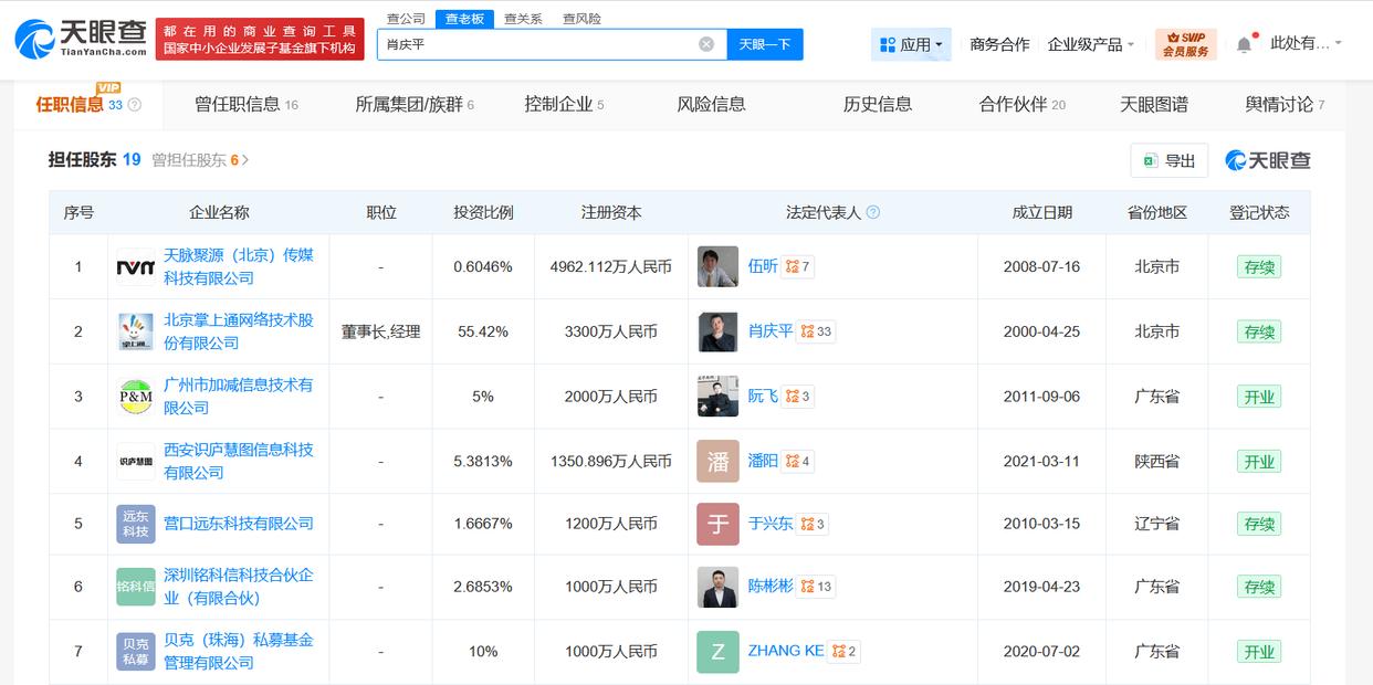 天眼查App显示,肖庆平名下共关联30余家企业,其中21家为存续状态,包括北京掌上通网络技术股份有限公司、广州市加减信息技术有限公司、海南天明农业环保科技股份有限公司、国投盛世承德环保建材有限公司等,肖庆平在上述企业中担任董事长、经理、监事等职务,版图涉及信息科技、金融、传媒等。任职信息显示,肖庆平在7家企业担任法定代表人,并持有19家企业的股份。