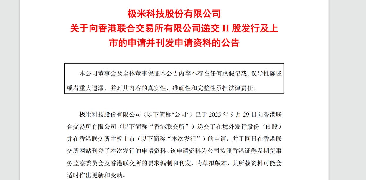 微成都报道 9月30日,科创板上市公司极米科技(688696.SH)发布公告称,公司已于2025年9月29日向港交所递交了在境外发行股份(H股)并在港交所主板上市的申请,并于同日在香港联交所网站刊登了本次发行的申请资料。